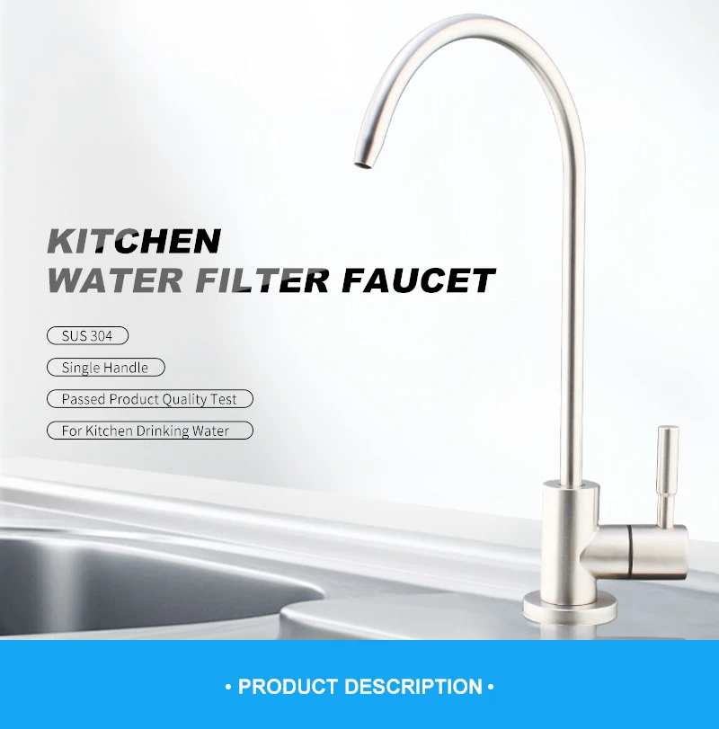 Product Description Model No.304-ZS001Product NameDrinking water filter faucetMaterialSUS 304 body.HandleSingle handleTemperatureBelow 40℃Surface TreatmentPolished and brushedCertificatesRohs. CETestSalt spray test. water hammer