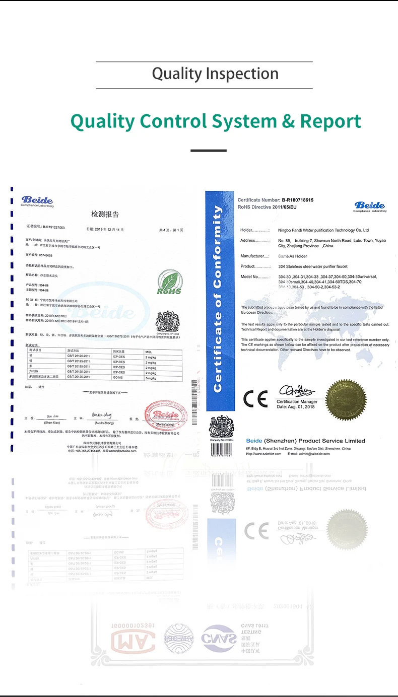 Ningbo Fandi Water Purification Technology Co.. Ltd. was established in 2009 .which is located in Jiangnan Industrial Zone. Lubu Town.Ningbo .China. Which is a high-tech enterprise specialized in producing stainless steel water purifier faucet.triangular valve.and other plumbing accessories.We have Quality Control Center. Research & Development Center and advanced equipments.Our products are all made of food grade 304 stainless steel . and has passed the ISO9001 quality system certification. we owned CE. ROHS .SGS certification .and China Center for Disease Control Certification and more than 30 test reports for products. All products are exported to United States. Germany.United Kingdom. Australia. Canada. Japan and other countries. Looking forward to cooperate with all of you around the world in the furure .welcomed to visit our company!
