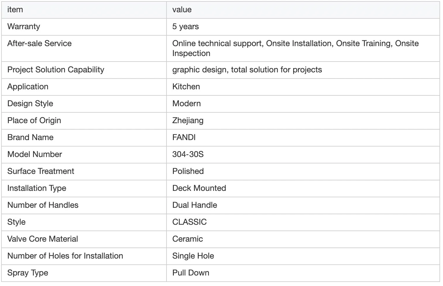 Product Description Model No.-30FProduct NameWater FaucetMaterialSUS 304 body. ceramics valve core materialHandleSingle handleTemperatureBelow 40℃Surface TreatmentPolished and brushedCertificatesRohs. CETestSalt spray test.