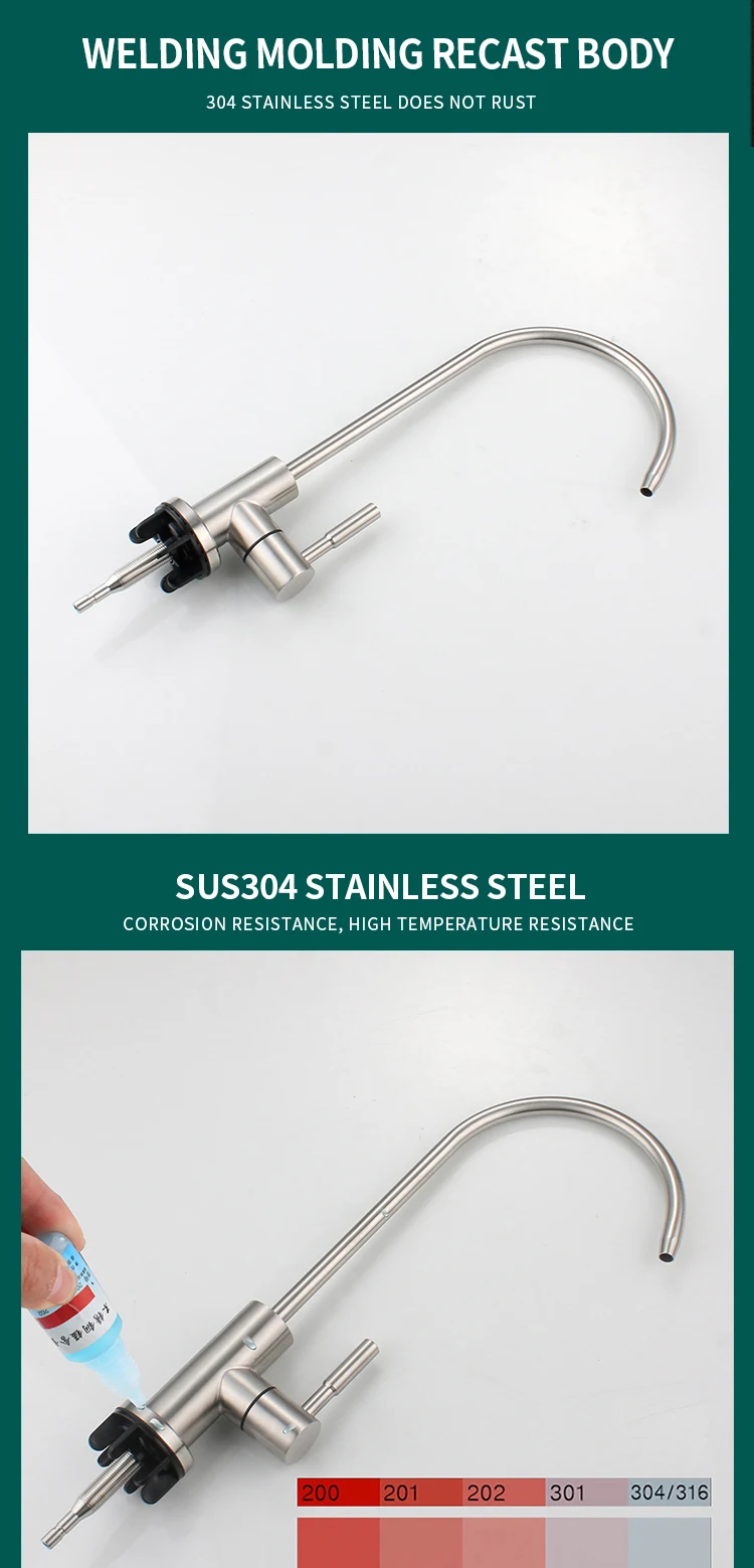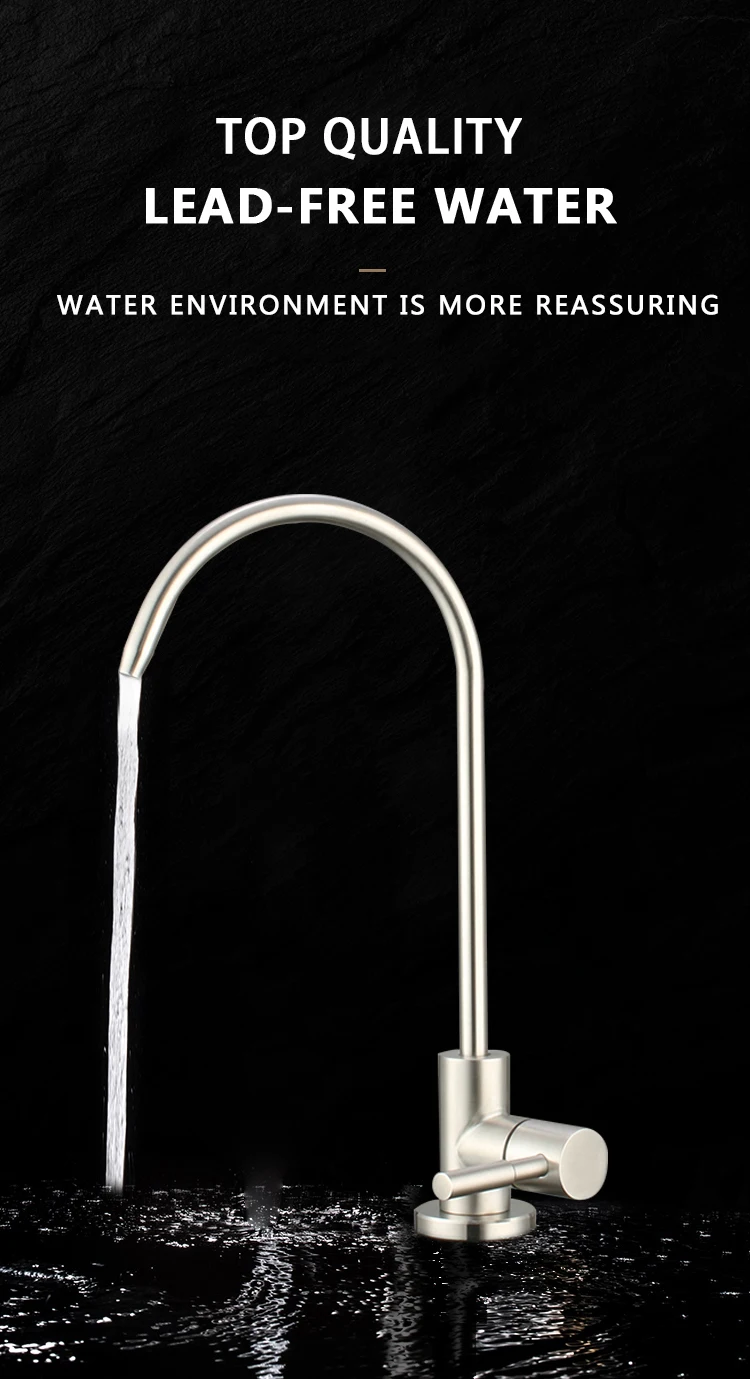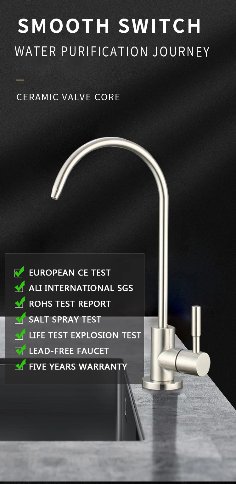 Product Description Model No.304-ZS001Product NameDrinking water filter faucetMaterialSUS 304 body.HandleSingle handleTemperatureBelow 40℃Surface TreatmentPolished and brushedCertificatesRohs. CETestSalt spray test. water hammer