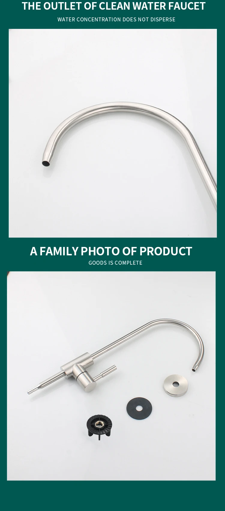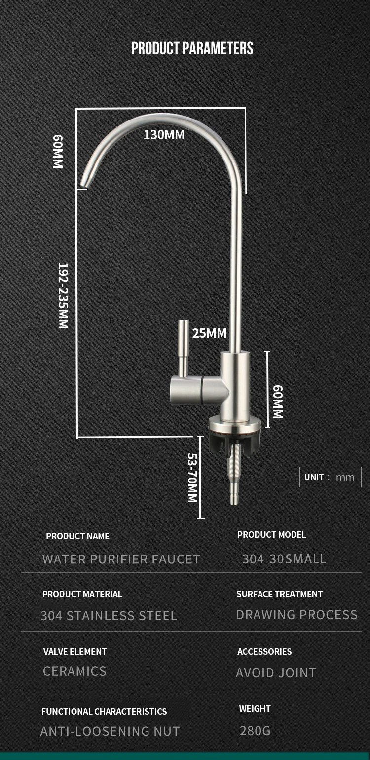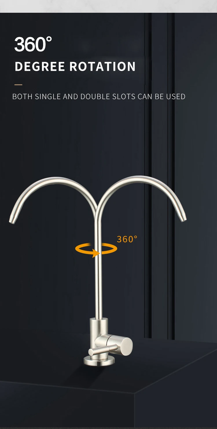 Product Description Model No.304-ZS001Product NameDrinking water filter faucetMaterialSUS 304 body.HandleSingle handleTemperatureBelow 40℃Surface TreatmentPolished and brushedCertificatesRohs. CETestSalt spray test. water hammer